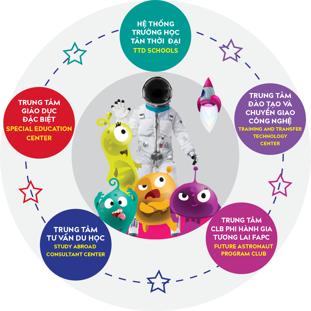 Hệ sinh thái giáo dục Tân Thời Đại gồm: Hệ thống trường học từ Mầm non tới THPT; Trung tâm đào tạo và chuyển giao công nghệ; Trung tâm CLB Phi hành gia tương lai (FAPC); Trung tâm Giáo dục Đặc biệt; Trung tâm Tư vấn du học.
