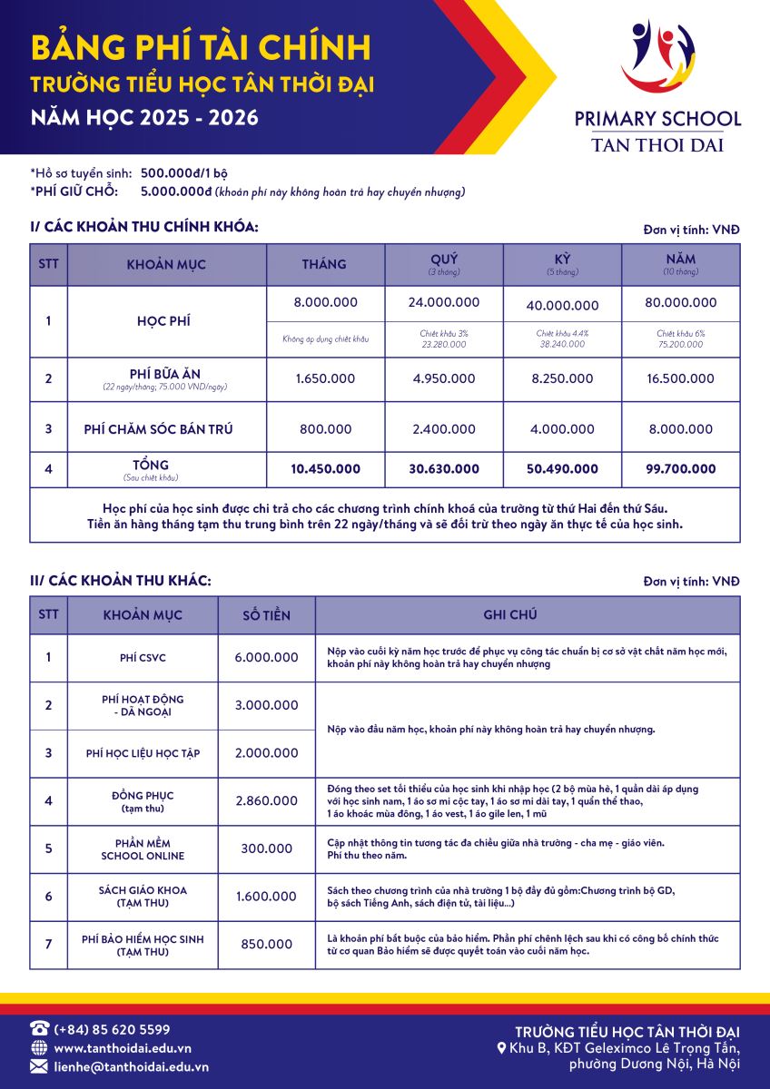 Chi tiết thông tin bảng phí tài chính tại trường Tiểu học Tân Thời Đại: học phí, các khoản phụ phí và chính sách ưu đãi