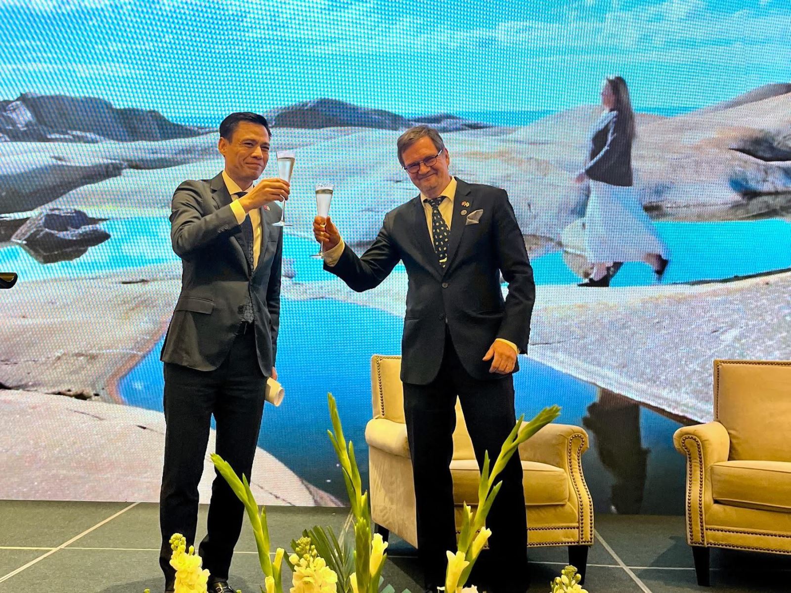Ngài Đại sứ Phần Lan Pekka Voutilainen và Thứ trưởng Bộ Ngoại giao Việt Nam Đặng Hoàng Giang nâng ly chúc mừng tại Lễ kỷ niệm 108 năm Quốc khánh Phần Lan tại Đại sứ quán Phần Lan.