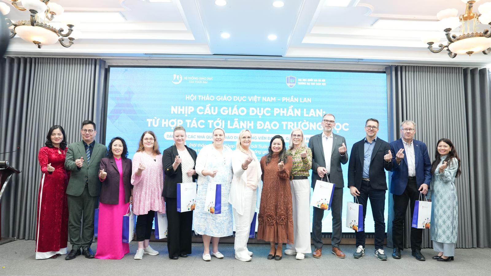 Nhà giáo Ưu tú Đinh Thị Tú – Phó TGĐ Hệ thống Giáo dục Tân Thời Đại (thứ 3 từ trái sang) cùng các đại biểu, diễn giả Việt Nam và Phần Lan chụp ảnh lưu niệm tại Hội thảo khoa học “Nhịp cầu Giáo dục Phần Lan: Từ hợp tác đến lãnh đạo nhà trường”, (11/1/2026).